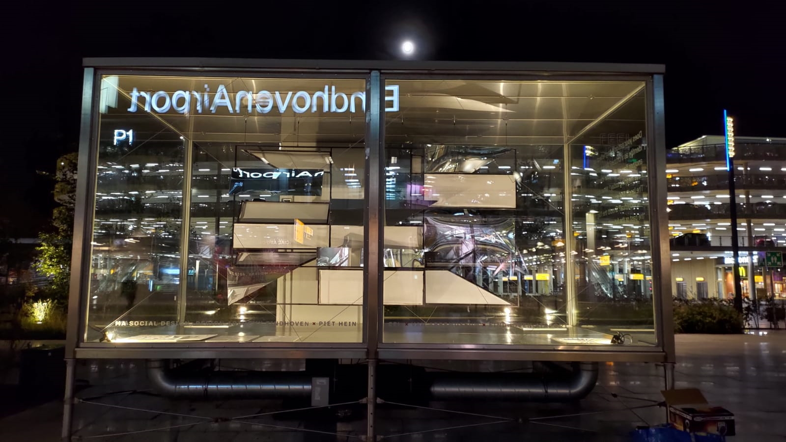 Muted framework, mirrors are placed on a transparent textile-covered cuboid frame. The interactions, movements in the immediate environment are reflected back to the viewer and questions one's perceptions of the present reality.